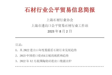 石材行業公平貿易信息簡報上海石材行業協會上海市進出口公平貿易石材行業工作站2023年8月2日日錄:1、從2022進出口年度數據看石材行業發展趨勢2、2023中國進口瓷磚巖板的現狀和趨勢3、2022年12月我國陶瓷磚進出口…