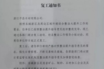東城新區(qū)及周邊區(qū)域環(huán)境綜合整治大提升領(lǐng)導(dǎo)小組辦公室復(fù)第006號(hào)復(fù)工通知書浙江平昌石材有限公司:按照東城新區(qū)及周邊區(qū)域環(huán)境綜合整治大提升工作的要求,你單位已按照整治提升指導(dǎo)意見組織整改完畢,現(xiàn)已通過各部…