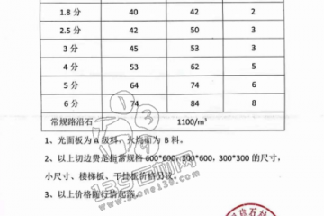 河南芝麻灰泌陽縣廠家從2月15日開始價格上調,附上漲后價格表!福建石材商會報價單因原材料價格上漲,從2023年2月15日開始陽縣芝麻灰石材價格調整如下:石材厚度1.8分2.5分3分4分5分6分常規路沿石火燒面毛板(元)40…
