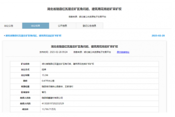 2月28日,隨縣銅鑫建材有限公司以近1.38億元競得湖北省隨州市隨縣年產600萬噸、儲量近億噸大礦,出讓年限15.5年。據了解,湖北省隨縣紅瓦屋莊礦區角閃巖、建筑用花崗巖礦查明資源量9228萬噸,其中角閃巖礦6148.5…