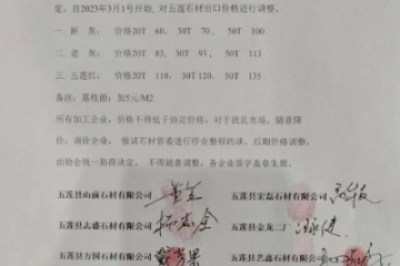 漲價潮來了,五蓮縣板材上漲3-5元,路沿石上漲100元,朋友圈全是漲價的節奏,慌了!由于礦山安全隱患排查整改,遲遲不能開工,石材荒料價格上漲,現板材每平米上浮3~5元,路牙石每立方上浮100元,本公司對已付款…