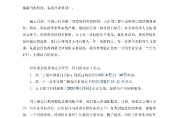 尊敬的參展商、參觀商及廣大業界同仁:為積極響應疫情防控需要,最大限度保證大家的安全與健康,原定于2022年5月5-8日的第二十二屆中國廈門國際石材展覽會將延期舉辦,具體日期將視情況另行通知。衷心感謝大家一…