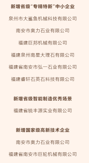 新增國家級高新技術企業南安市奧力石業有限公司福建省南安市巨輪機械有限公司