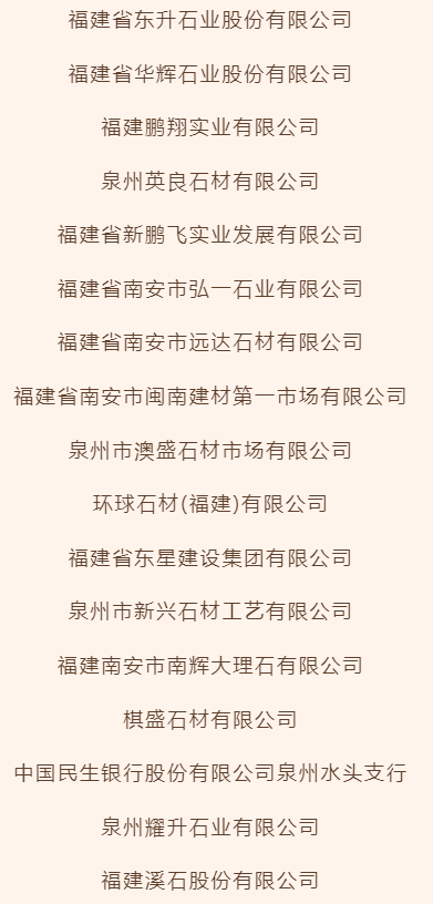 福建省東升石業股份有限公司福建省華輝石業股份有限公司福建鵬翔實業有限公司泉州英良石材有限公司福建省新鵬飛實業發展有限公司福建省南安市弘一石業有限公司福建省南安市遠達石材有限公司福建省南安市閩南建材第一市場有限公司泉州市澳盛石材市場有限公司環球石材(福建)有限公司福建省東星建設集團有限公司泉州市新興石材工藝有限公司福建南安市南輝大理石有限公司棋盛石材有限公司中國民生銀行股份有限公司泉州水頭支行泉州耀升石業有限公司福建溪石股份有限公司南安云創置業有限公司盛達建材集團有限公司南安市水頭康利石材有限公司福建南安市新三星石業有限公司福建泉州市鼎固建材有限公司福建省泉州市利源石業有限公司福建省南安市力豐石材有限公司南安市澳磊石業有限公司南安市恒美石業有限公司福建省泉州市日升石業有限公司福建和潤石業有限公司福建創力集團有限公司福建睿軒石英石科技有限公司福建省南安市盈華石業有限公司2024年度上市企業及榮獲國家級重點“小巨人”稱號等企業名單南安市石材協會新增省級“專精特新”中小企業泉州市大鯊魚機械科技有限公司南安市奧力石業有限公司福建巨邦機械有限公司福建泉州南星大理石有限公司福建省南安市弘一石業有限公司福建睿軒石英石科技有限公司