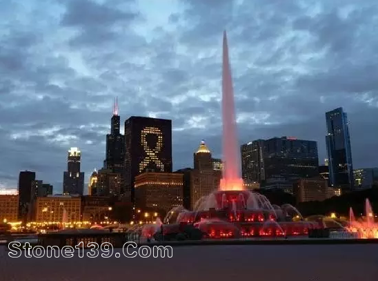 芝加哥的地標性建筑白金漢噴泉(Buckingham Fountain)建于1927年,是世界第一大照明噴泉,比法國凡爾賽宮大噴泉足足大一倍。它從四月工作到十月,在冬季,噴泉裝飾著節日燈。