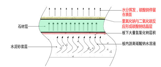2.1.1  石材加工廠家使用不合格的石材防護劑,使刷在石材表面上的防護劑沒有起到防水作用,造成在水泥砂漿濕鋪貼施工時,水泥中的1%~2%的堿性物質(氫氧化鈉)將與空氣中的二氧化碳反應,生成的碳酸鈉溶液使石材表面出現大面積不規則的水斑原理如下圖。