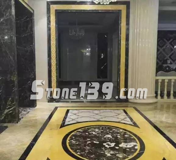 過道以方圓圖形展示,寓意沒有規(guī)矩不成方圓,黑色與金黃色的色系搭配,令空間大氣莊重,環(huán)形圖案內(nèi)的石材運用,頗具獨到之處,斑斕,深沉,有內(nèi)蘊乾坤之感。