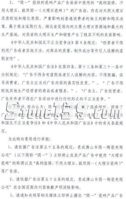 8月26日,湖北省石材工業協會正式向國家工商總局及中央電視臺提交投訴函,舉報佛山市簡一陶瓷公司(以下簡稱“簡一”)目前投放的產品廣告存在嚴重的虛假宣傳和商業詆毀問題,希望相關部門予以制止,并責令整改,全文如下: