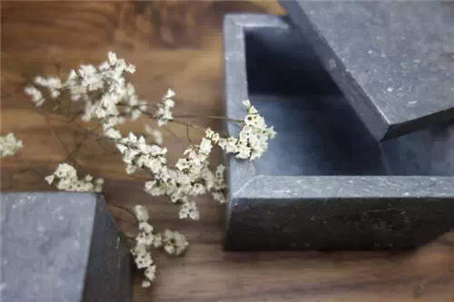 墨色的方形石材在視覺上非常接近文房四寶中的“硯”,將其打磨挖鑿成巴掌大的帶蓋方體,無論是在里面放上首飾珠寶,抑或是一些剛摘下的新鮮花瓣,只是簡簡單單的擱置在木桌上,就能讓房間充滿文雅氣息,甚至可以感覺到有墨香在空氣中流動。
