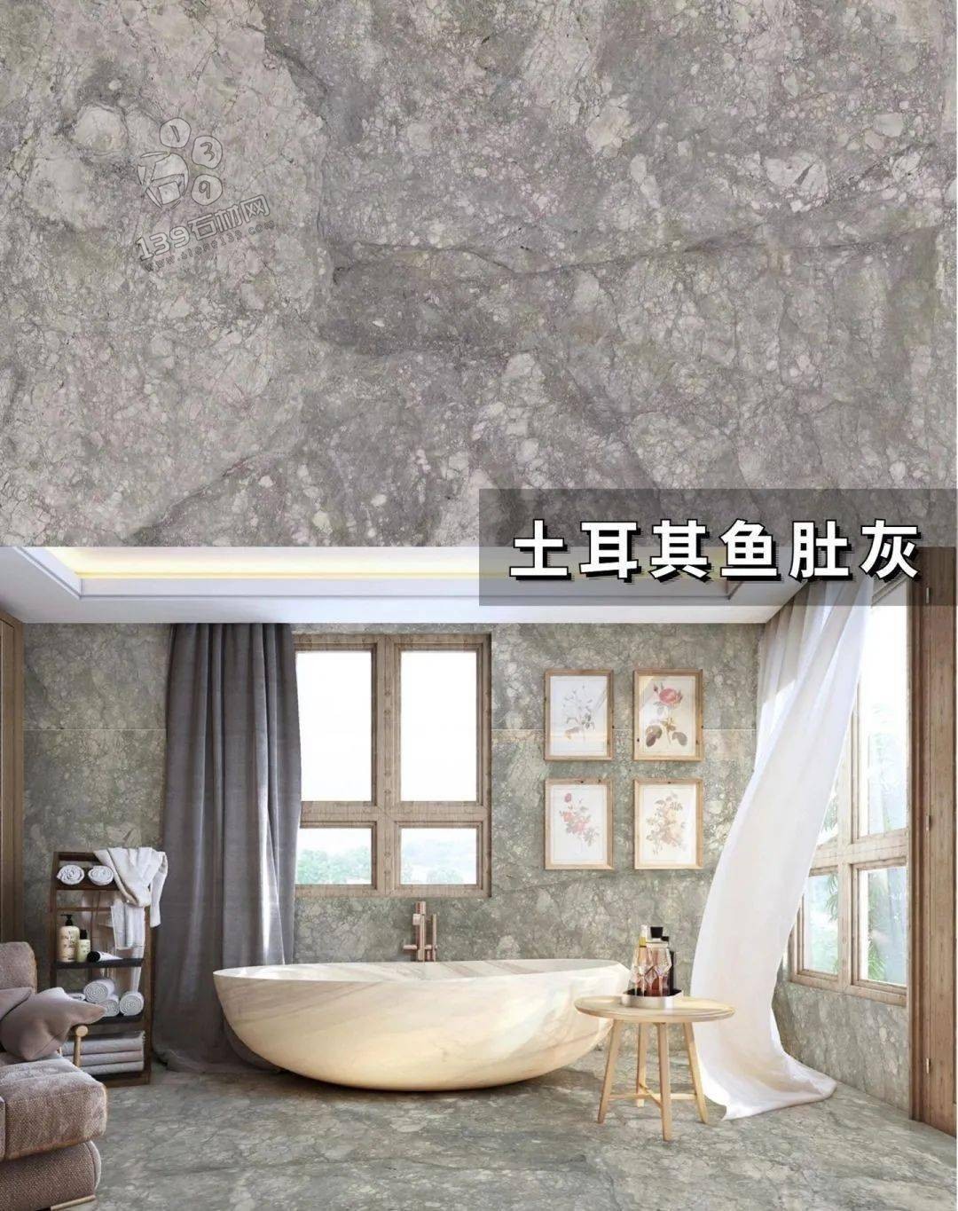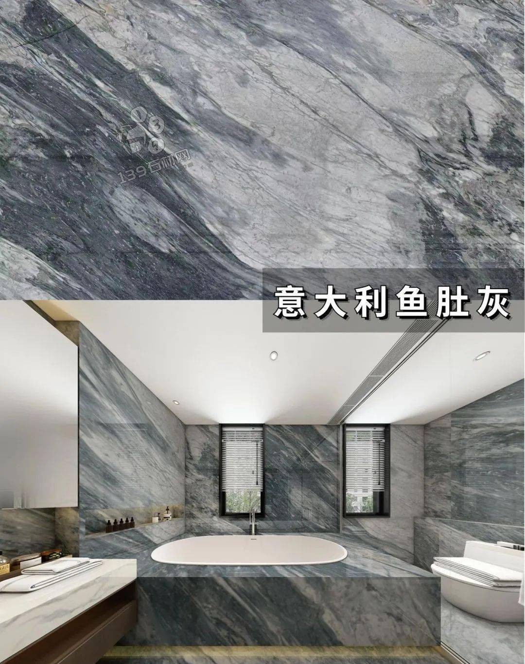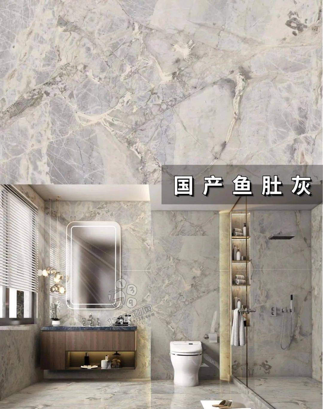 國產魚肚灰,小編認為最好看的魚肚灰,板面帶有藍色基調,紋理夸張不失美感 在實際案例中有著相當出色的表現。